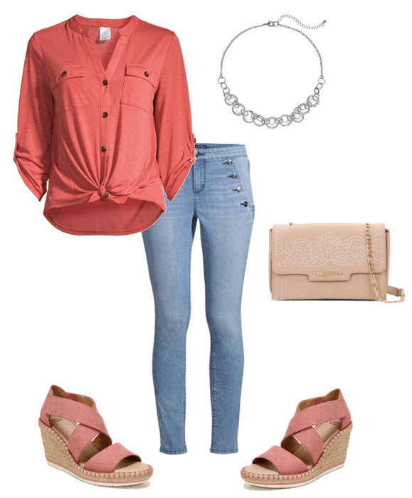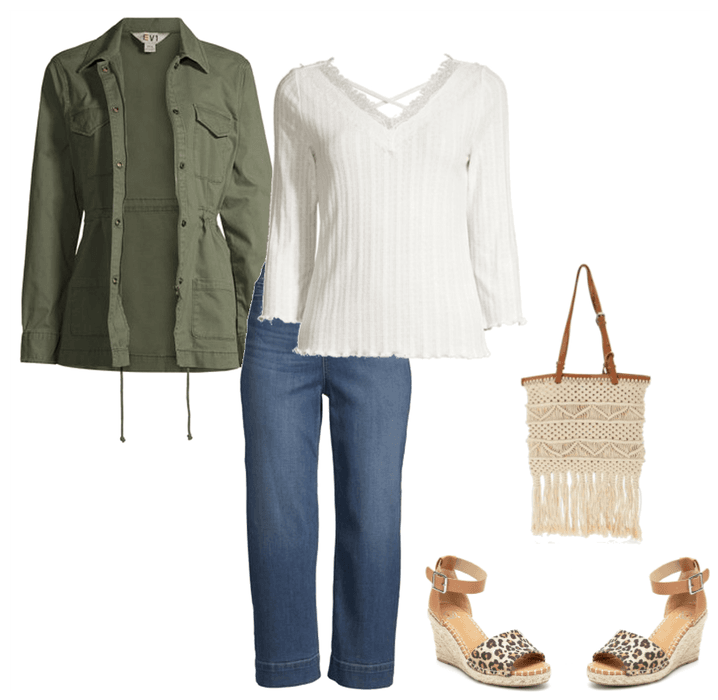 Safari style jackets are a popular piece right now. They are super cute and just the right weight for early Spring and cool Summer evenings. And these neutral wedge sandals with a touch of leopard print are so good and they are under $30.00.