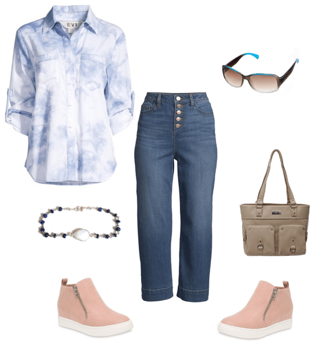 Really cute casual outfit for heading out to all the Spring craft festivals and carnivals. The wedge sneakers has been a favorite of mine. They are so comfortable yet look really stylish. And we’re seeing lots of tie dye around. This blue and white tie dye blouse is really pretty and not over the top if you’re not into the bright tie dyes.