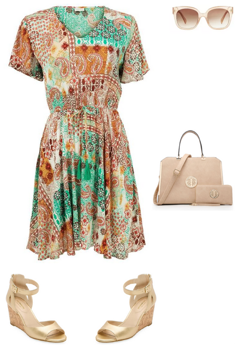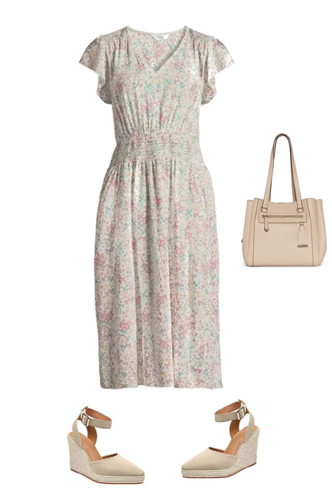 Such a pretty soft color and also under $20.00. This pretty little dress is great for Sunday church, brunch, showers and vacation. Neutral accessories give this a very chic look.